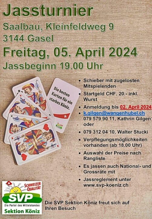 Am letzten Freitag, 5. April fand das erste Jassturnier unserer Sektion statt. Das Jassturnier war in allen Belangen ein absolut gelungener Event. Der Saalbau in Gasel war bis auf den letzten Platz ausgebucht. Es haben 100 Jassende am Turnier teilgenommen. Alle Teilnehmenden konnten aus dem Gabentempel einen Preis nach Hause nehmen. Gespielt wurde ein Schieber mit zugelosten Mitspielenden. Mit dem Startgeld von bescheidenen Fr. 20.- konnten sich die Jassenden auch noch mit einem Imbiss, Brot und Wurst aus einheimischer Produktion, stärken.
