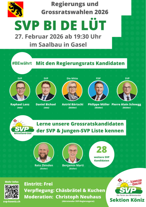 Die SVP Sektion Köniz lädt zu einer Podiumsdiskussion mit dem Titel „SVP BI DE LÜT“ ein. Die Veranstaltung findet am 27. Februar 2026 ab 19:30 Uhr im Saalbau in Gasel statt und dreht sich um die Regierungs- und Grossratswahlen 2026 im Kanton Bern (Wahltag: 29. März 2026).